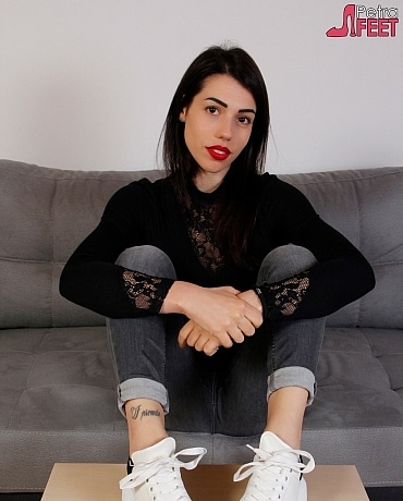This web site contains sexually explicit material:Impossibly beautiful brunette Petra's got such a busy day today. She has been wearing a pair of spotless and immaculate white sneakers all day, and her sexy feet are all sweaty, hot and damp now. The brunette stunner takes off her shoes and black socks, sniffs them, and lures you with her luscious feet. She then puts her feet on the coffee table, and smokes a cigarette, while incessantly pointing, wiggling, spreading and flexing her delicious toes.