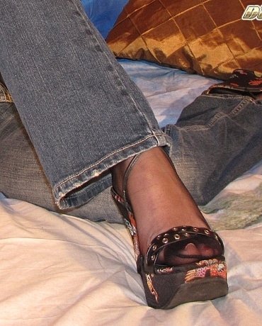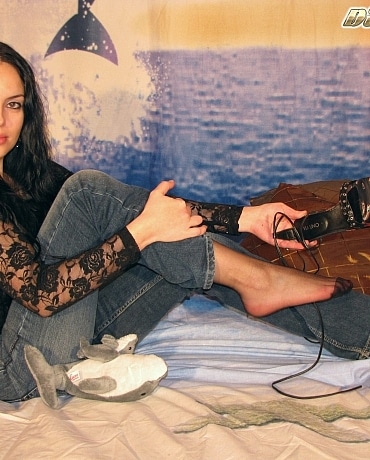 Diana looks as hot as jalapeño in a black shirt, dark blue jeans, black nylons and lace up platform sandals with extreme heels. Look at her. She is such a hottie. Diana is sitting on her bed, ready to give you a steamy hot foot tease. Watch closely as she slowly unties and removes her sandals, reveals her nyloned feet and plays with a dolphin soft toy, while seductively teasing you with her nylon-covered feet.