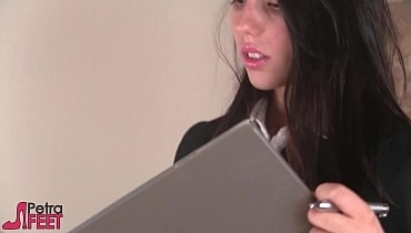 This web site contains sexually explicit material:Sexy secretary Petra looks hotter than the surface of the sun in a white shirt, black jacket, black skirt, sheer grey tights and black suede platform pumps. She looks stunning when wearing sheer tights that highlight her natural beauty. Watch as Petra slides her nyloned feet in and out of her shoes, sits at her desk and works, while wiggling her nylon-clad legs, flexing her arches and letting her shoes dangle off her toes until they fall to the floor.
