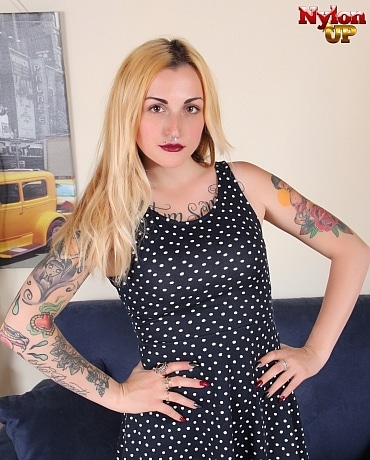 This web site contains sexually explicit material:Super sexy Medusa Blonde looks hotter than a summer heatwave and stuns in a classy dark blue mini-dress with tiny white polka dots. Underneath her lovely dress the blonde beauty is wearing only nude pantyhose, and a very sexy pair of high-heeled sandals adorn her stunning feet. Smoking-hot Medusa Blonde is posing seductively on the sofa, and then takes off her sandals, dress and bra and teases you with her nylon-clad feet.