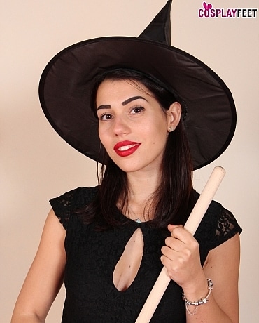 This web site contains sexually explicit material:Gorgeous Miss Petra looks hot as hell in her sexy witch costume which includes a black mini dress with a matching black witch hat and black patterned pantyhose. She is sitting on a grey couch, with a broom in her hands and her pantyhosed feet placed on a little table in foreground, allowing you to check out every inch of her lickable soles. Watch as she uses a magic formula to transform you into a little toy man and crushes you under her nyloned feet.