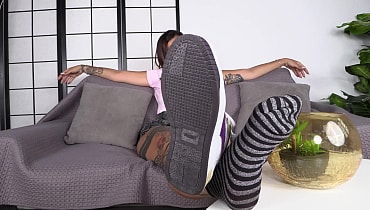 Who says that a MILF can't channel her inner young self and express it through clothes? Diana Zili is no exception to that. Donning a pastel top, denim skirt, sparkly socks, and sneakers, she's no ordinary babe to mess with. The tattooed oldie ditches the show, huffing the nasty scent from the socks. To completely enjoy the reeking aroma, Diana laid the long feet and flaky soles bare. The pair of flippers isn't the only teasing part of it, but the peeking burgundy thong that the brunette MILF takes off after. While crimping the untrimmed toes, she plays with the shaved pussy, fondling the throbbing clit as well. Then, Diana exposes a big suckable pair of tits, glazing the nipples with spit, before doing the dirtiest part of the tease—piss play. Without hesitation, the pierced strumpet makes a piss rain over the plant inside the fishbowl. She makes a mess on the marble floor, smearing the drips of urine using Diana's pads.