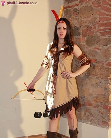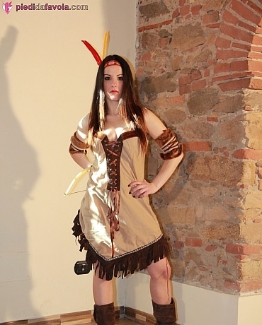Sexy Bianca will take you time back in that little brown dress with brown matching boots. Let her catch you with her arrow and enjoy her taking off the boots to her sexy bare feet. Your mouth will be watering while you watch her perfectly arched feet and while she caresses her foot sole with a leather whip. Doesn´t she look gorgeous in this Indian American Cosplay Outfit.