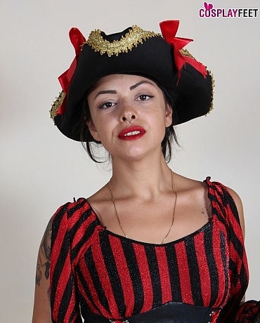 This web site contains sexually explicit material:Irresistible Nebraska is a real knockout and looks stunning in a sexy pirate outfit consisting of a black and red striped mini dress with matching hat and eye patch. Her gorgeous feet are perfectly enveloped by a super sexy pair of black and red platform stilettos. The stunning hottie flaunts her long legs and toned thighs, takes her shoes off and lures you with her lovely feet with high arches, sexy little toes and elegantly shaped toenails painted in bright red.