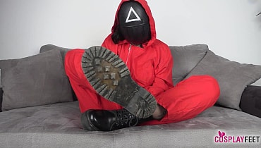 This web site contains sexually explicit material:It might not be Halloween, but Tokyo doesn't mind. The tattooed diva sits cross-legged on the grey couch, already in her red jumpsuit and combat boots—the only thing missing is her mask. Lifting and fitting the black mesh headpiece with a white triangle painted on it on her face, Tokyo finally completes her look. Getting into character, she talks in an intimidating manner, which shows that she's in charge of the day. The dominating babe unzips her boots, flexing her black stockings and inked feet, shin, and calves before stripping off one. Tokyo stretches and curls her toes near the face of her lover, knowing he's salivating from the sight and smell of her bare feet. Unsatisfied, she unzips her coverall to reveal the enticing sight of her huge tits kept hidden underneath the baggy clothing. The dark-haired minx continues to tease using her tattooed feet, from her wrinkled soles and pretty arches to her ankles and long toes, flexing and wiggling them about while her boobs squeeze against each other as if letting her watcher pick if he'd like a footjob or titjob. Tokyo has plenty of plans, and she can't wait to execute them soon.