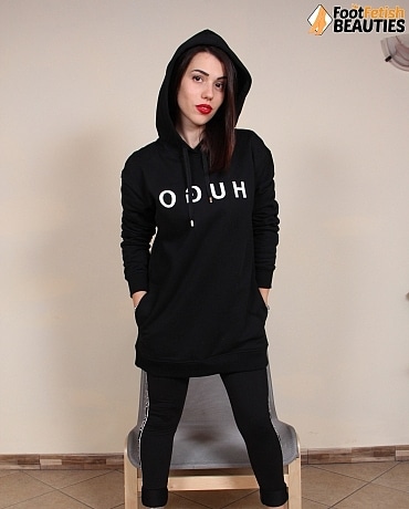 This web site contains sexually explicit material:Gorgeous Petra looks hotter than a summer heatwave even without showing an inch of skin. She looks smoking hot in a black oversized hooded sweatshirt paired with side-striped leggings that cling to her every curve. A very sexy pair of pink ankle-strap platform sandals with extreme heels adorn her delicate feet with black painted toenails. Super-hot Petra unstraps and takes off her shoes, flaunts her amazing feet and spreads her delectable toes.