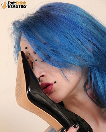 Deliciously sexy Denise looks hotter than the surface of the sun in a pink crop top paired with a pink mini skirt and a super sexy pair of burgundy pantyhose that make her tattooed legs look amazing. Her luscious feet are clad in an ultra-sexy pair of patent black pointed-toe pumps with skyscraper stiletto heels. The blue-haired babe exudes sexiness as she poses seductively on a pink couch, takes off her shoes, rolls down her nylons and licks her sexy feet.
