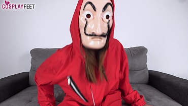 Upon muffling her mouth's victim with the cloth, Valerie is forced to spit the code into the vault. While clad in a red jumpsuit and eerie mask, Valerie shows who's in authority over the situation. After unveiling her mask, the dominating woman will pull all the tricks up her sleeve just to make the victim talk. Right off the bat, Valerie unzips her combat shoes to lure the man with her stinky feet. With nylon stockings on and toe rings, it would be hard to resist her sensual technique. After discarding her stinky stockings, the foul smell grew more powerful. The torture continues by stuffing her sweaty feet inside the victim's mouth, creating a mixed emotion of arousal and fear.