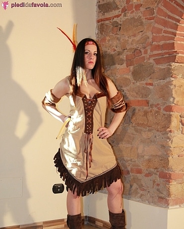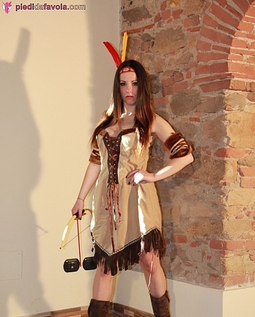This web site contains sexually explicit material:Sexy Bianca will take you time back in that little brown dress with brown matching boots. Let her catch you with her arrow and enjoy her taking off the boots to her sexy bare feet. Your mouth will be watering while you watch her perfectly arched feet and while she caresses her foot sole with a leather whip. Doesn´t she look gorgeous in this Indian American Cosplay Outfit.