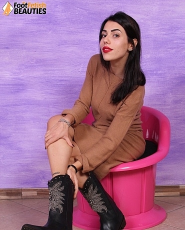 This web site contains sexually explicit material:Super-hot Petra is such a queen and looks sexier than ever in a long sleeve, beige sweater dress and Camperos boots. The brunette stunner shows off her boots, takes them off, flaunts her sensational legs and places her delicious feet on the coffee table. She then takes off her black ankle socks, sniffs them, spreads her elegantly shaped toes and teases you with her bare feet.